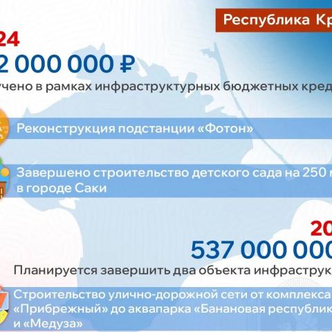 В 2024 году Республика Крым в рамках инфраструктурных бюджетных кредитов получила более 512 млн рублей.