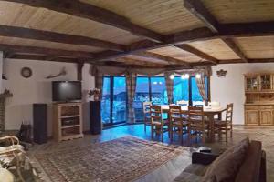 Двухэтажный коттедж-шале, построенный в охотничьем стиле, с каминным залом и видовыми окнами на горы. На участке русская дровяная баня и бассейн с родниковой водой.