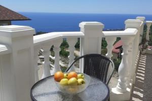 Рядом с выходом - зона отдыха с садовой мебелью: стол, скамья и кресла. Отсюда, и с балконов, и из окна открывается роскошная панорама - море, долина, горы.