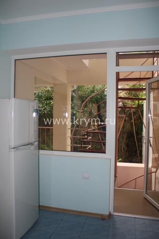 В проходном помещении на этаже большой холодильник, обеденный стол, посуда, электрочайник, микроволновая печь.