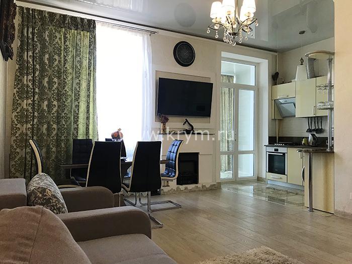 3) кухня-гостиная - 35м2 : телевизор SAMSUNG 49" ULTRA HD 4K ,встроенная кухня с бытовой техникой BOSCH (варочная поверхность,духовой шкаф,эл.чайник),двухспальный угловой диван-кровать,односпальное раскладное кресло-кровать,эл.камин,обеденный стол,кондиционер.