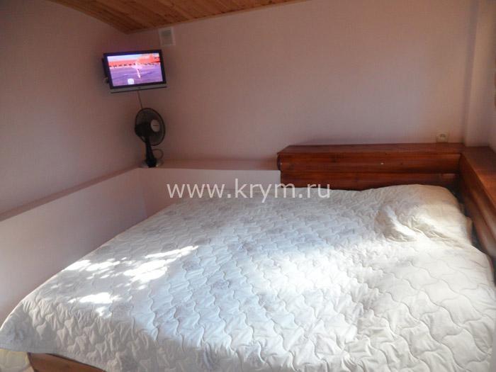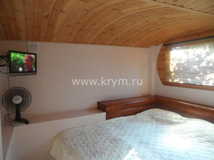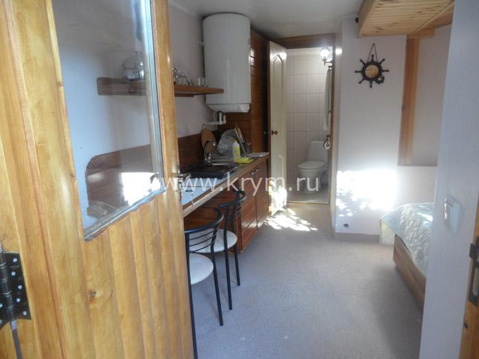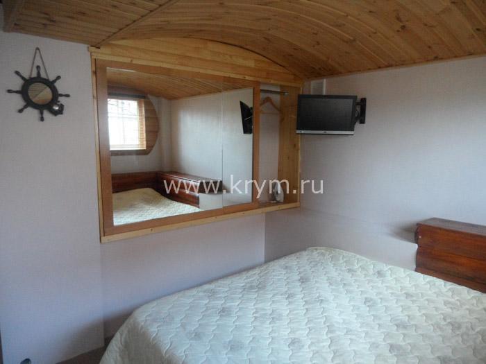 - в квартире: мини-кухня (электро плита, холодильник, столешница-мойка, посуда), санузел (туалет, душ), в комнате большая двуспальная кровать, зеркальный шкаф-купе, телевизор (кабельное ТВ), общая площадь - 14 кв.м., квартира имеет низкие потолки (2-2,2 метра), стилизована под каюту;
