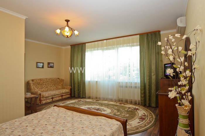 В номере: прихожая с гардеробом, большая двуспальная кровать с двумя прикроватными тумбами, комод с зеркалом, раскладной диван, журнальный столик, кондиционер, телевизор, холодильник. Вся мебель и сантехника европейского производства.