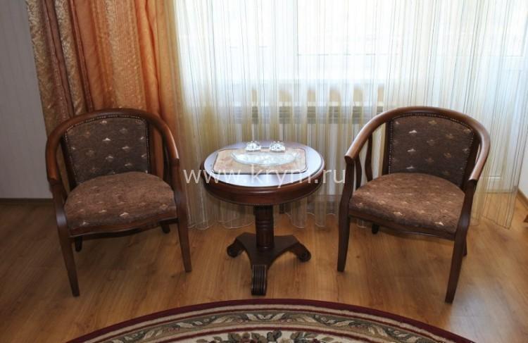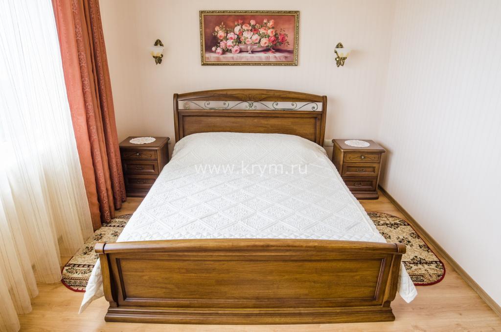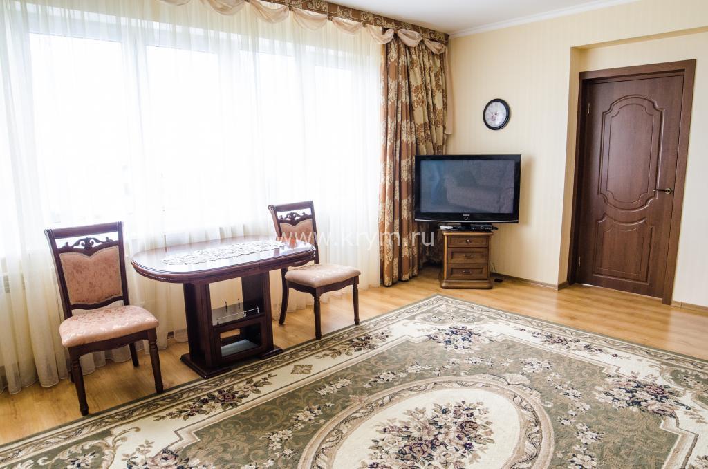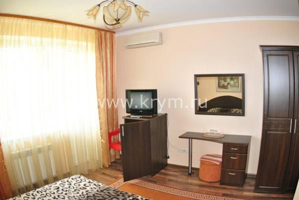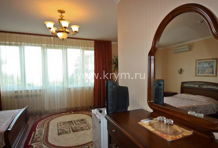 Светлый семейный полуторакомнатный номер, в окна которого заглядывают верхушки крымских сосен. В номере санузел, балкон с видом на море, телевизор, кондиционер, холодильник.