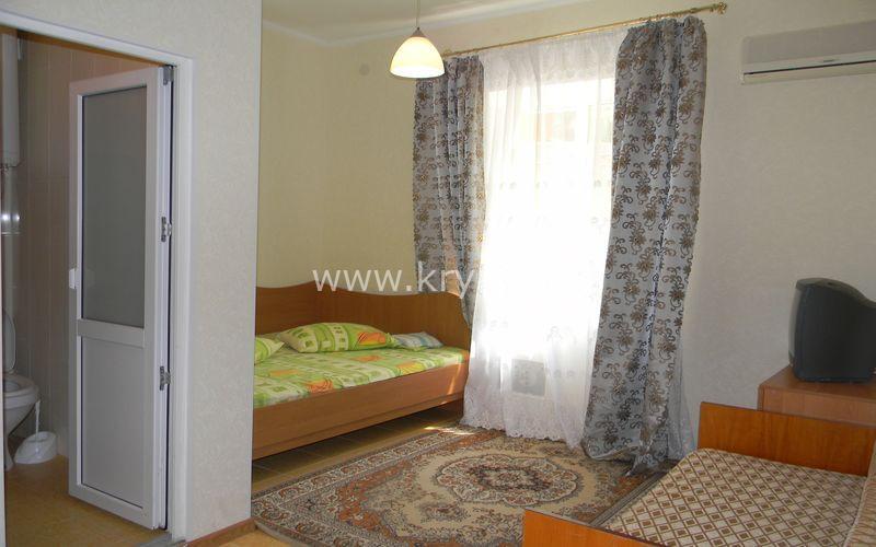 Номер с собственными удобствами и необходимой мебелью расположен на 1м этаже. Маленькое окно, без вида, выход сразу на улицу, зелень, детская площадка.