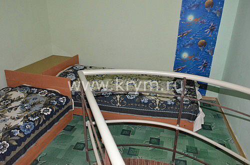 Номер в двух уровнях . На первом этаже односпальная кровать,а на втором 2 односпальных кровати . Номер необычный ,уютный и удобен для семьи с детьми от 5 лет.