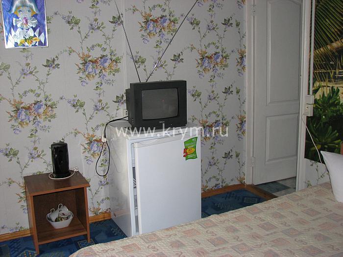 В номере есть душевая, санузел и умывальник .Вода горячая круглые сутки. Имеется двух спальная кровать и раскладной детский диван, ля детей до 16 лет, шкаф с зеркалом, камод, 2 стула, телевизор, столик и чайная посуда. Холодильник на кухне 300 литров на 2 номера(с №3). Рядом с номером дворик с столом и креслами и большая летняя кухня с набором посуды, столом, стульями, кухонной мебелью и уголком для глажки. Номер прохладный даже в сильную жару. Душевая оборудована вытяжной вентиляцией.