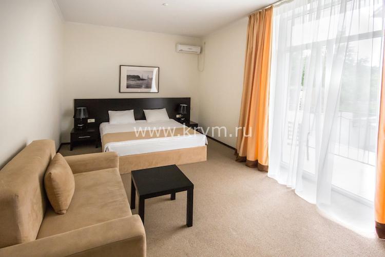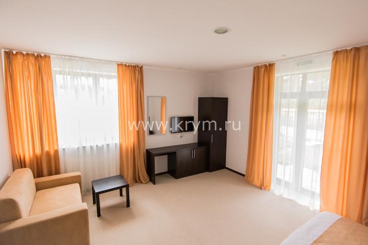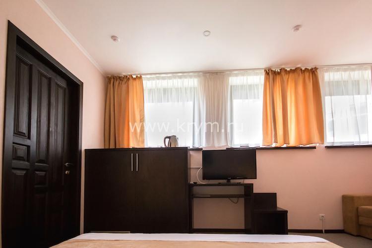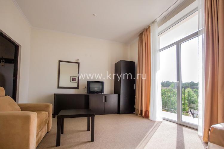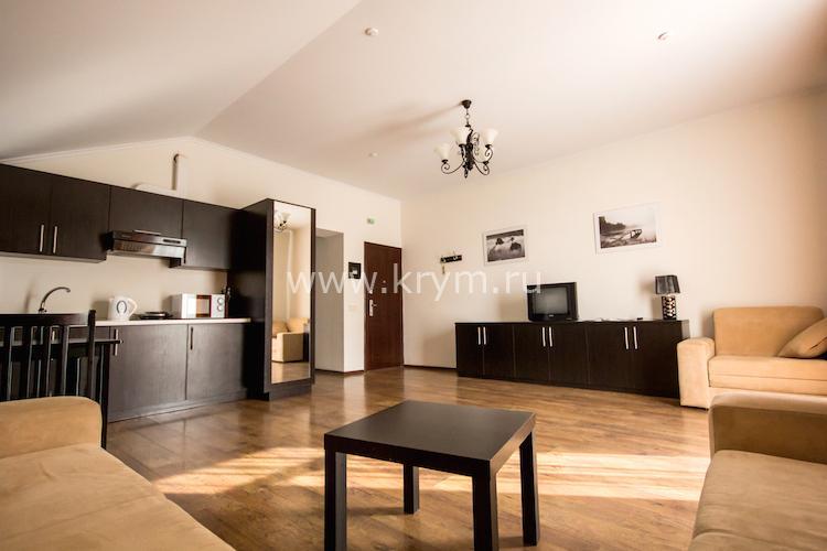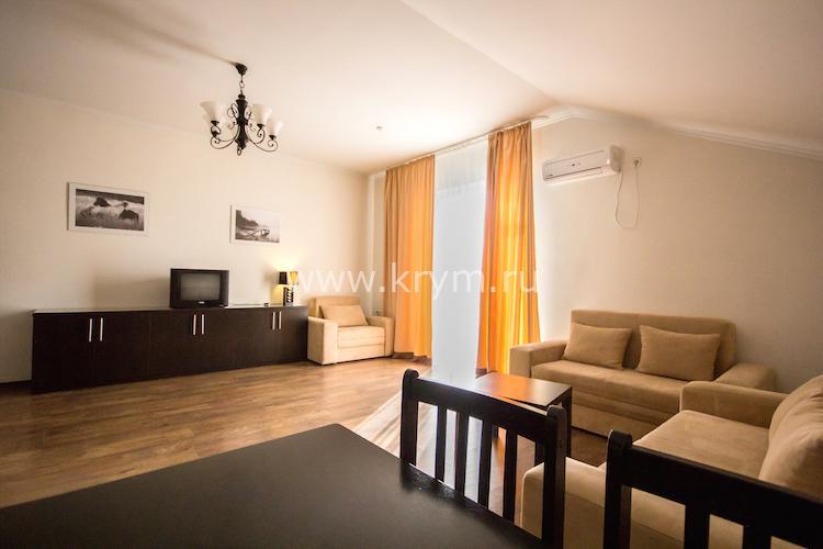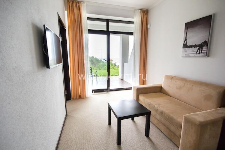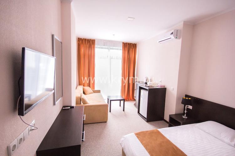 Просторный двухкомнатный номер с кухней, расположен на третьем этаже в 4-м корпусе. Занимает половину этажа. В номере 2 балкона, один из них выходит в сторону моря. В спальне кровать King size, в гостиной 3 дивана. В каждой комнате кондиционер и телевизор.