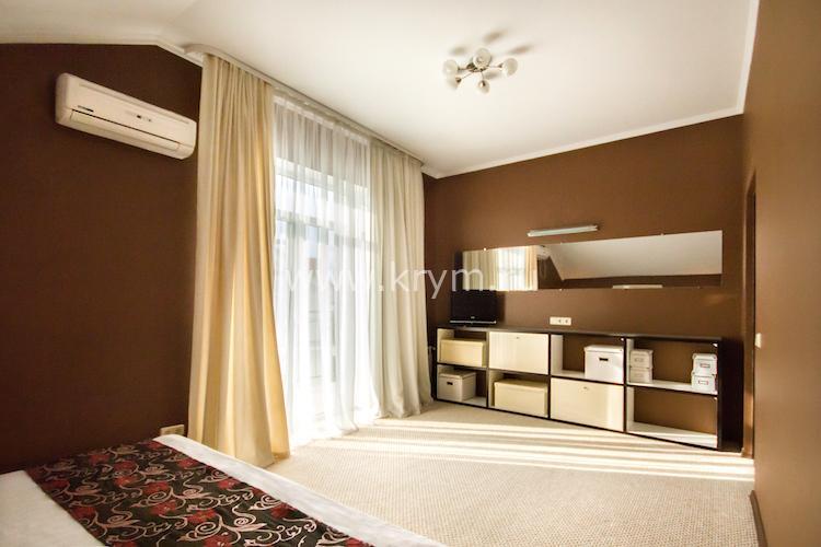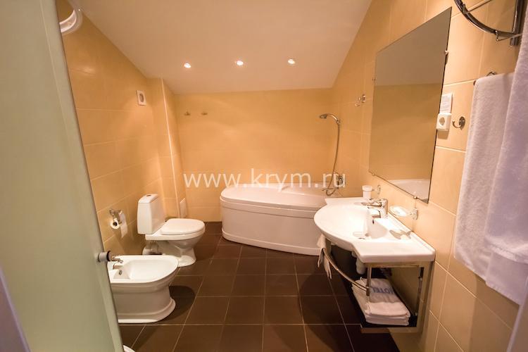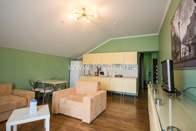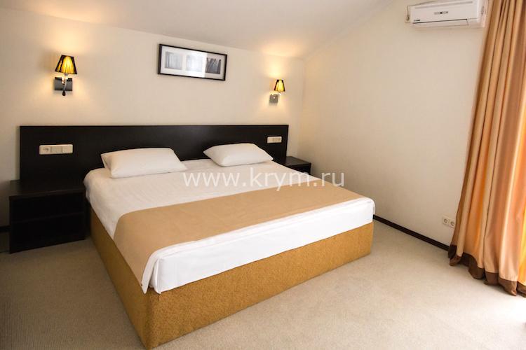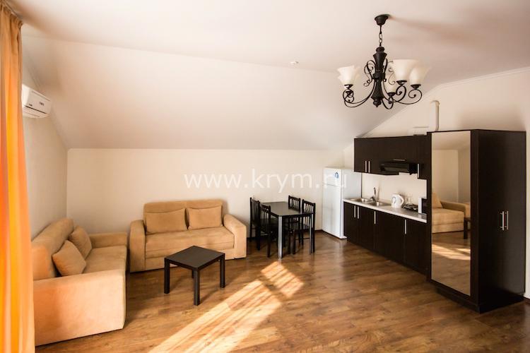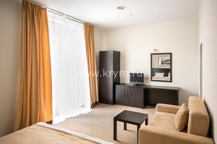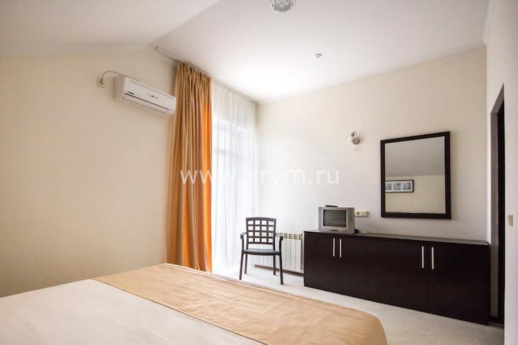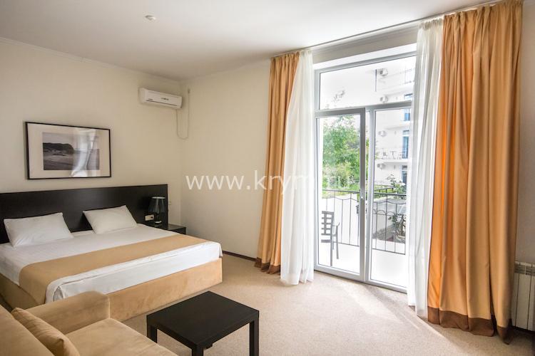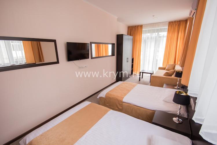 Просторный двухкомнатный номер с кухней, расположен на третьем этаже в 4-м корпусе. Занимает половину этажа. В номере 2 балкона, один из них выходит в сторону моря. В спальне кровать King size, в гостиной 3 дивана. В каждой комнате кондиционер и телевизор.