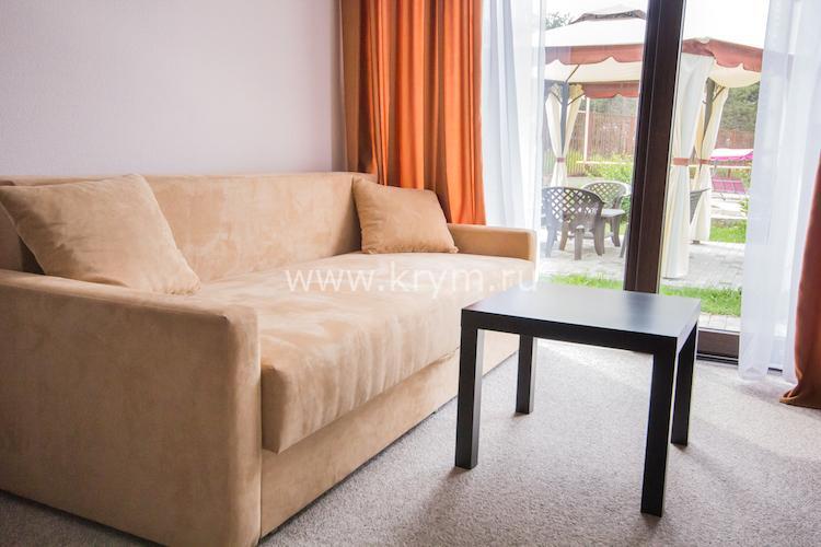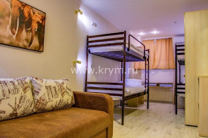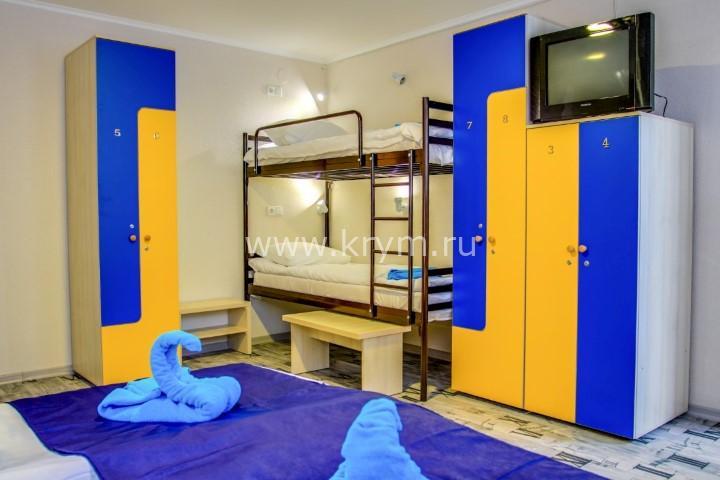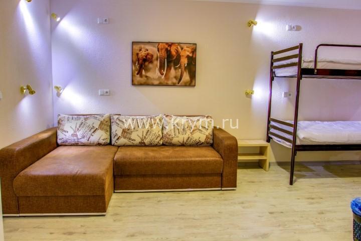 В двух других: угловой раскладывающийся диван и две двухъярусных кровати. Номера расположены на нулевом этаже.