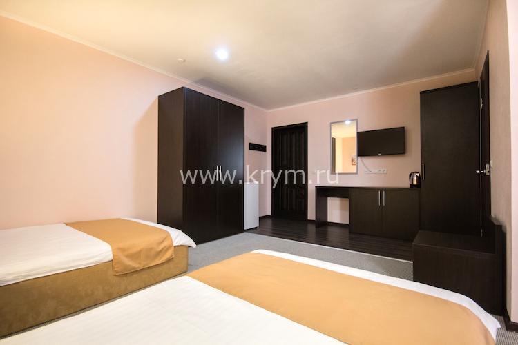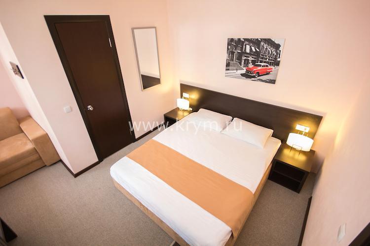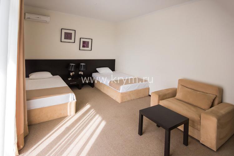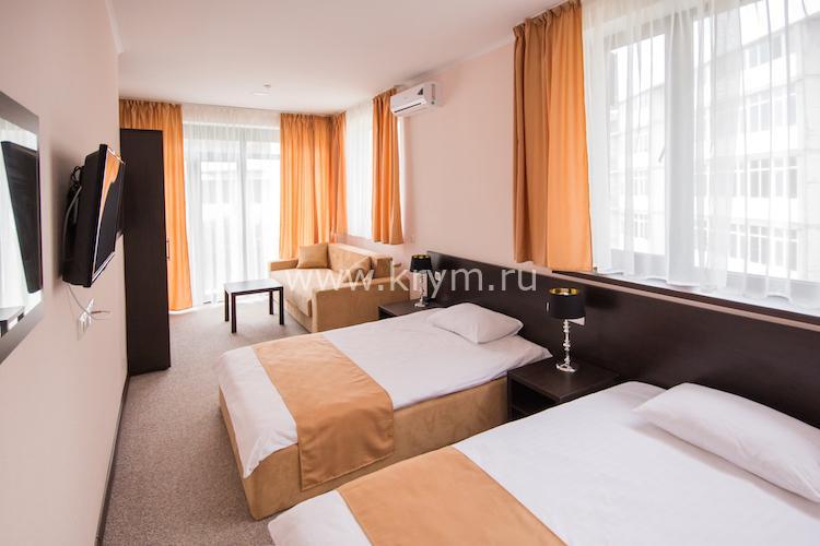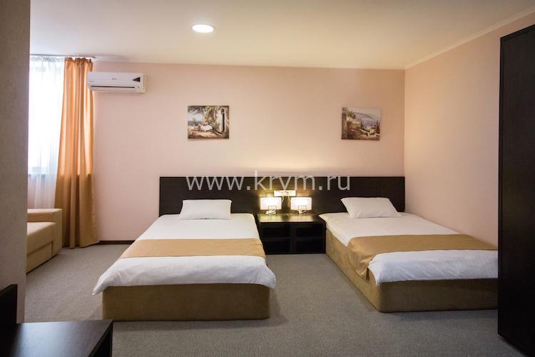 Двухкомнатный номер с изолированными спальнями. Без балкона. В одной комнате две кровати, во второй диван с ортопедическим блоком пружин и спальным местом 160х200.