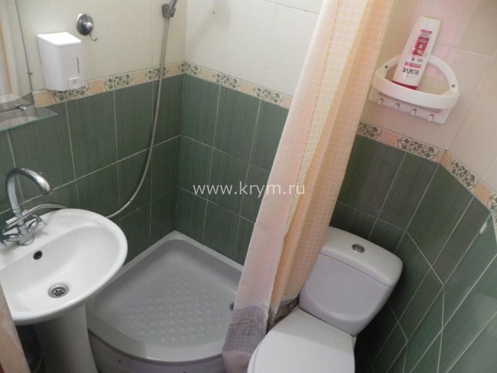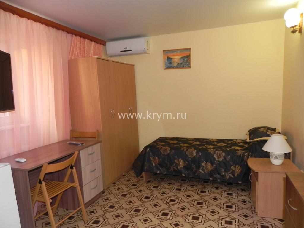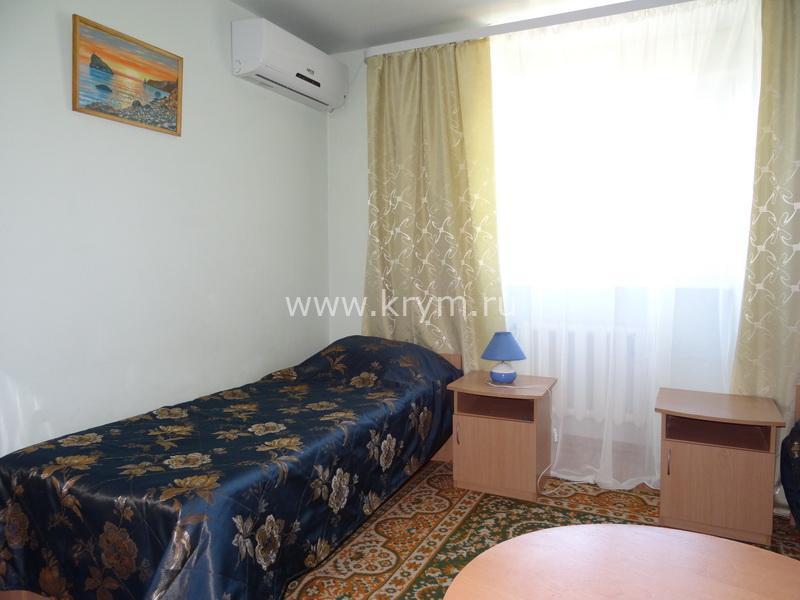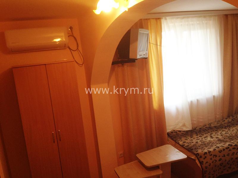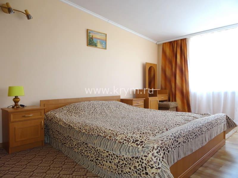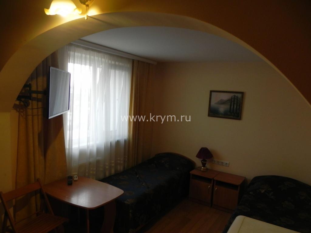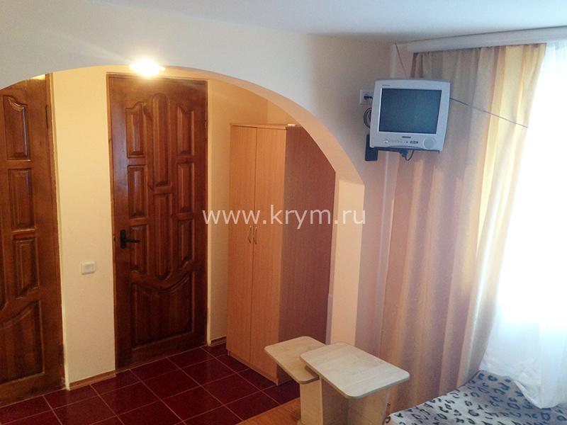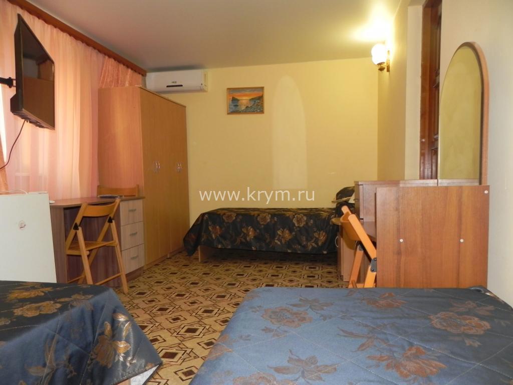 В номере: двуспальная кровать, три односпальные кровати, шкаф, комод, тумбочки, стол с, стулья, кондиционер, смарт-телевизор, интернет, холодильник, микроволновая печь, чайник, фен, свой удобный сан. узел.Особенностью этого номера является большой закрытый балкон, увитый виноградом, где можно любоваться прекрасным видом на море, горы, удобная мебель располагает к отдыху на свежем воздухе.