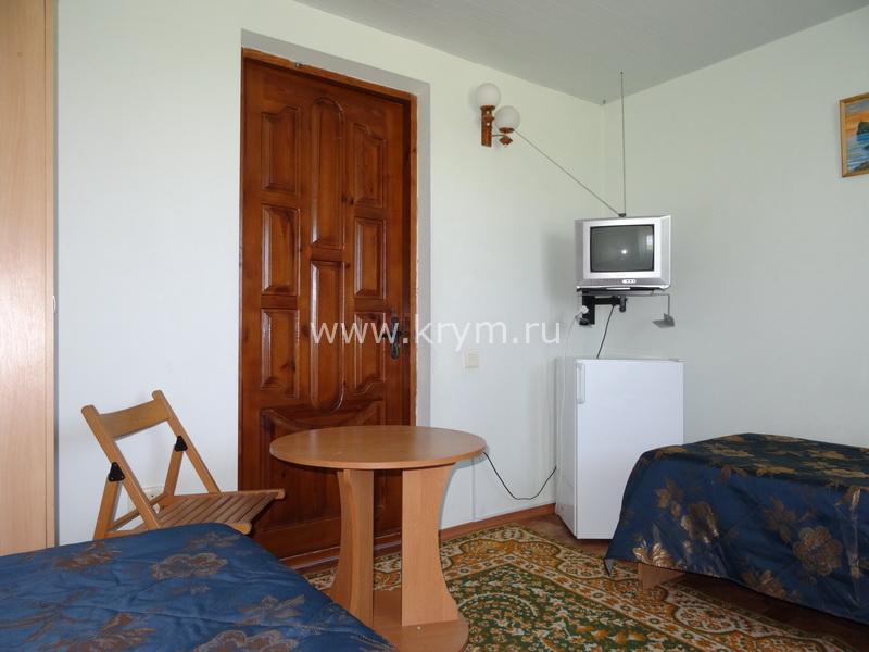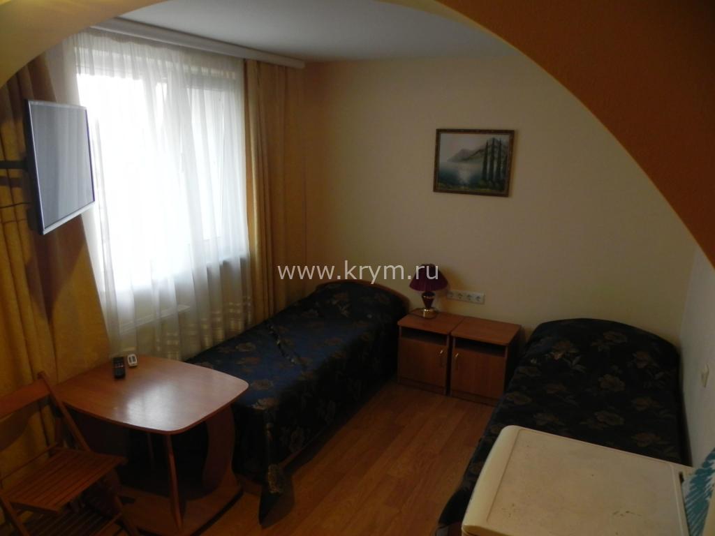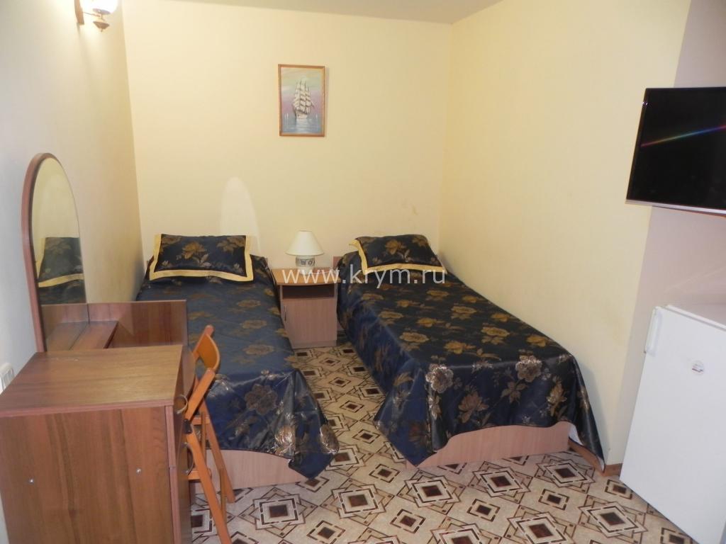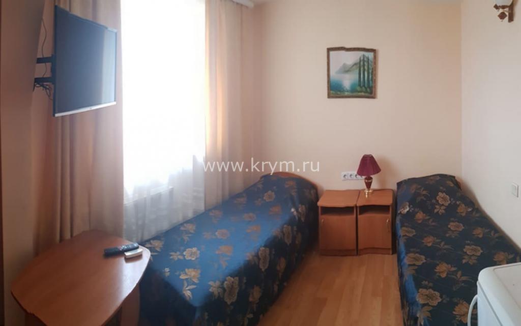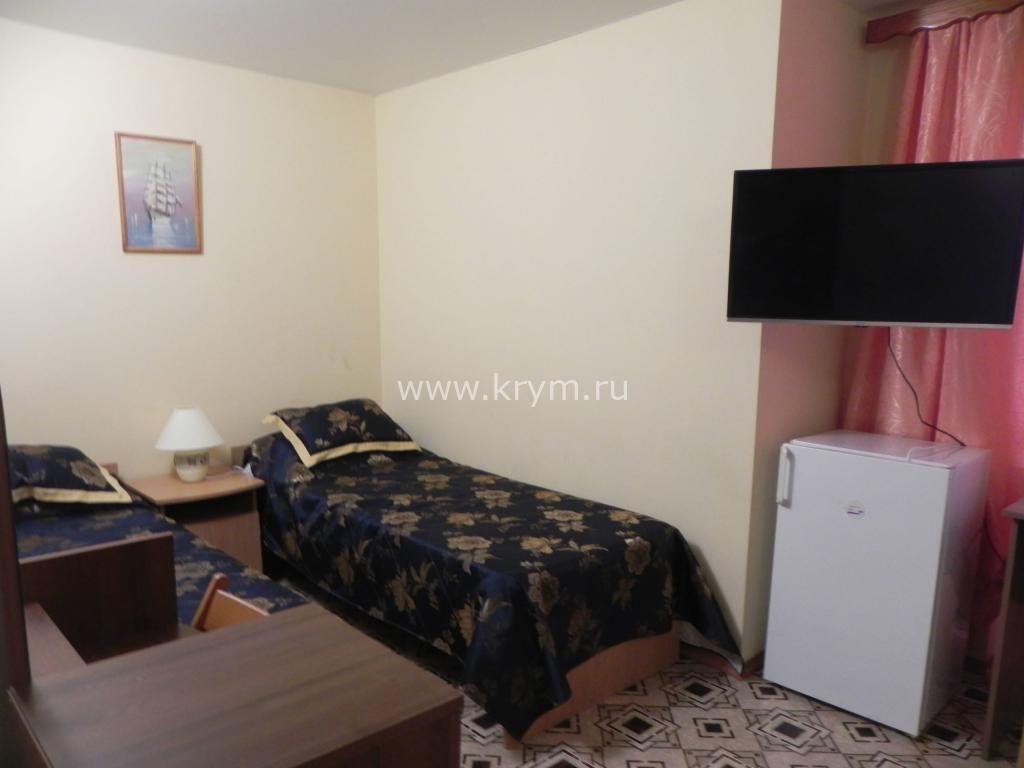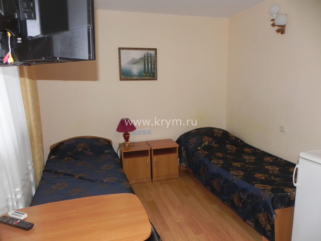 В номере: две односпальные кровати (можно сдвинуть для варианта двуспальной), холодильник, ТВ.