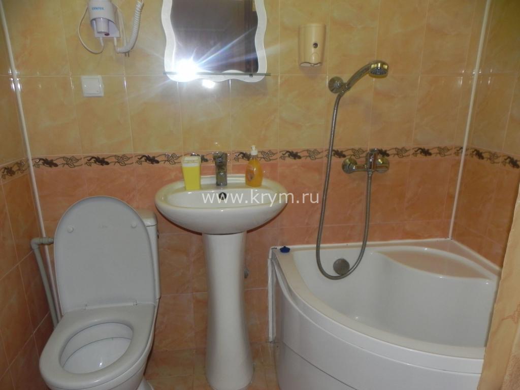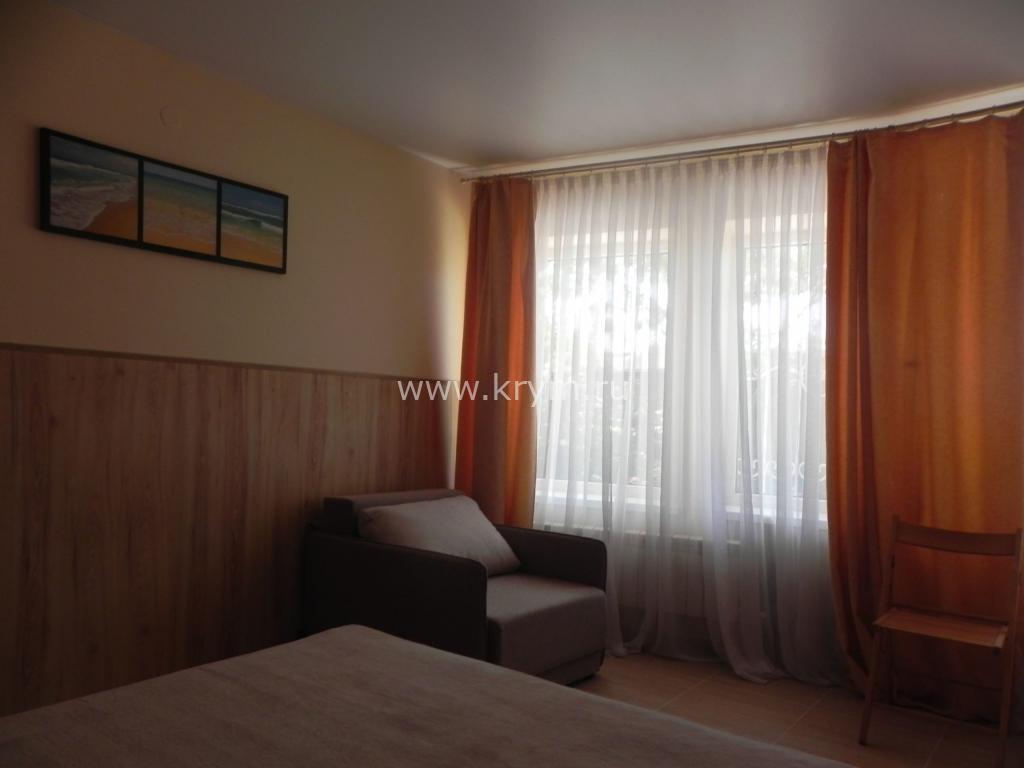 Окна и двери (стеклопакеты) выходят на большую благоустроенную террасу со столиком с прекрасным видом на внутренний дворик, горы. Тихое журчание фонтана и крымская природа располагают к наслаждению отдыхом.
