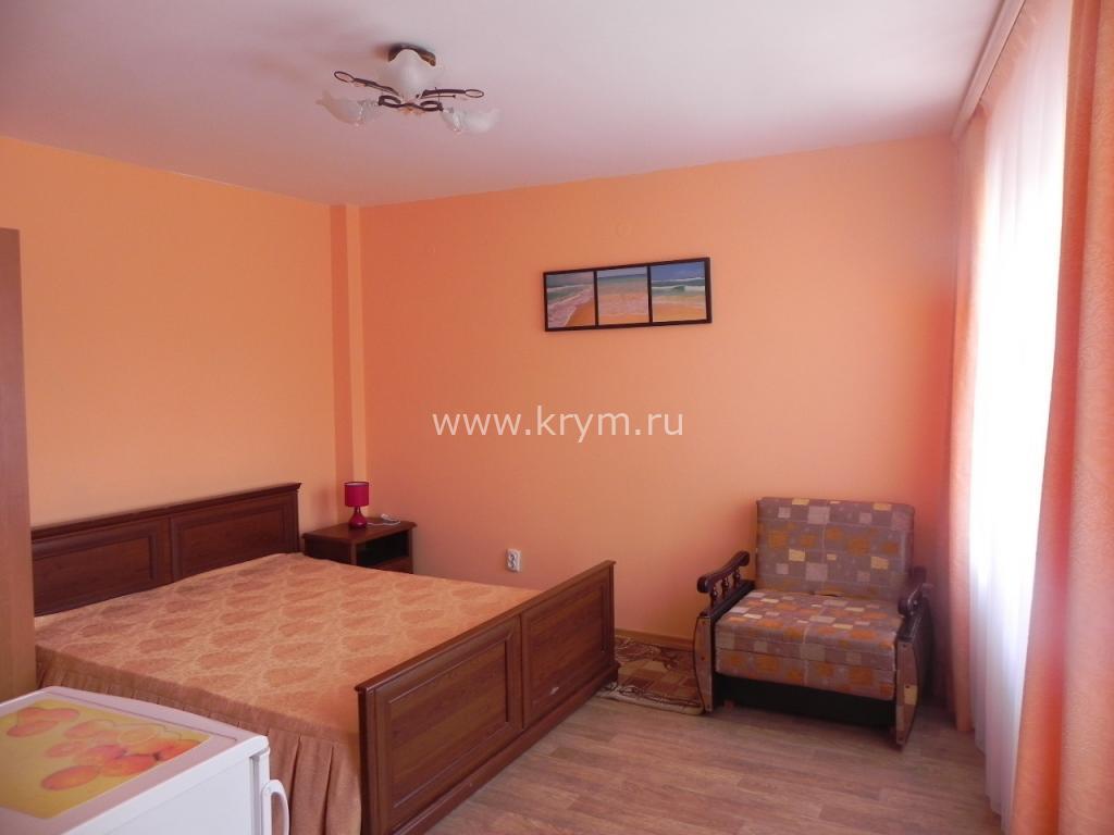 В номере: двуспальная кровать, новое кресло-кровать, смарт-телевизор, кондиционер, интернет, шкаф, тумбочки, стол, стулья, холодильник, чайник, фен, свой удобный раздельный сан. узел. Выход из номера во внутренний дворик, рядом большая красивая беседка с фонтаном.