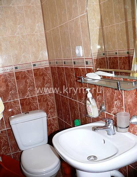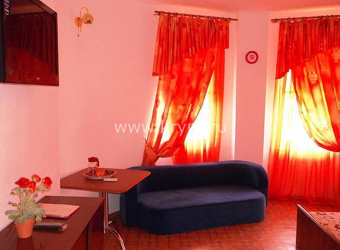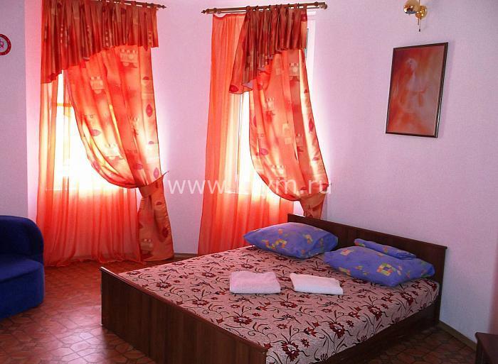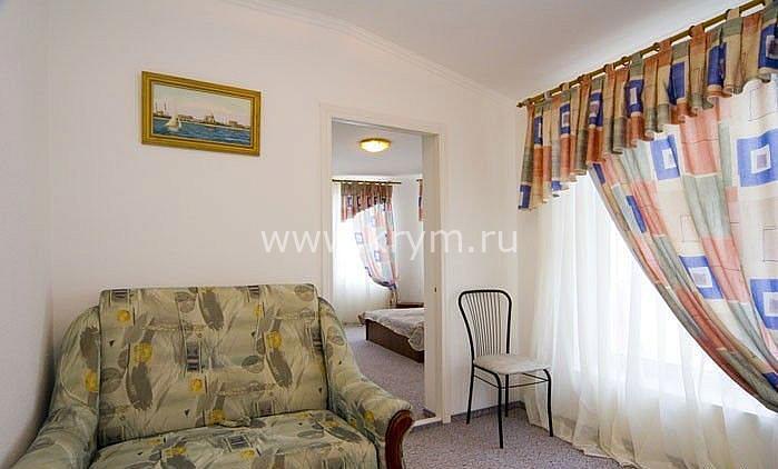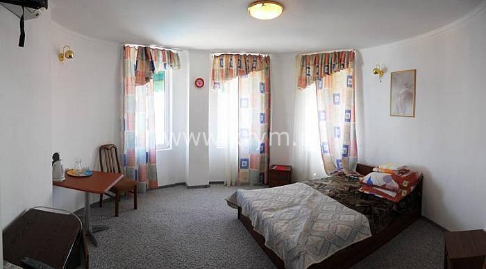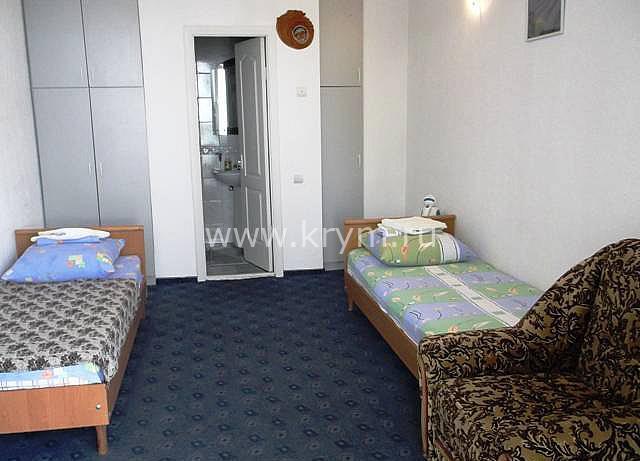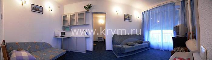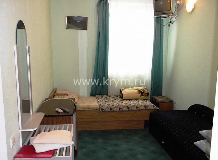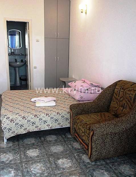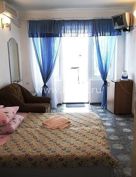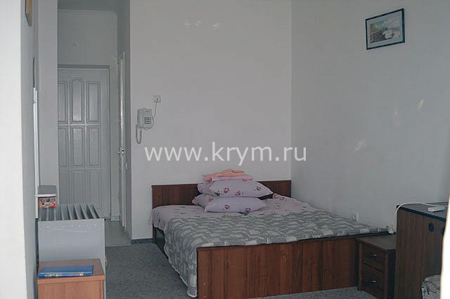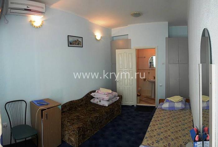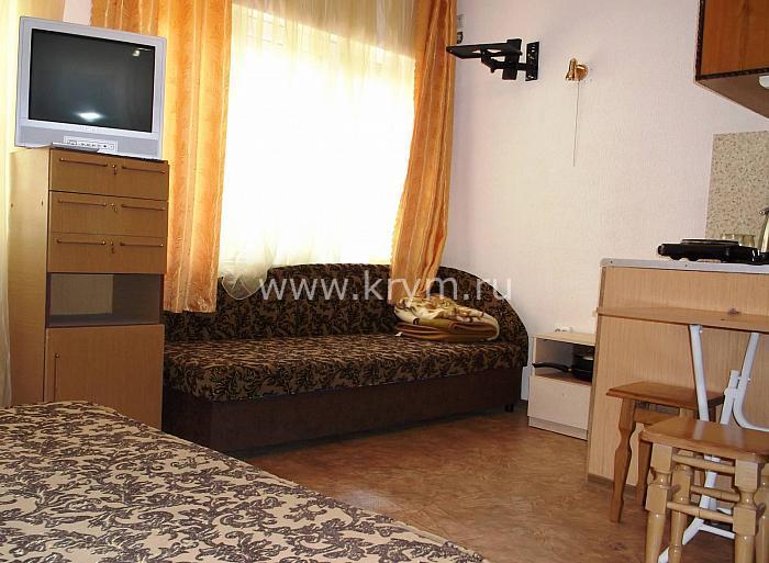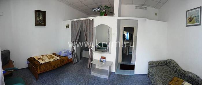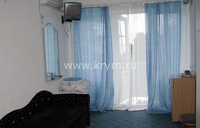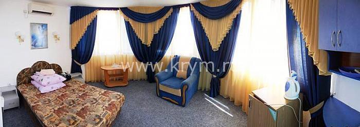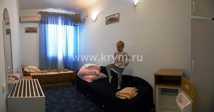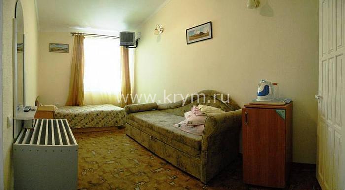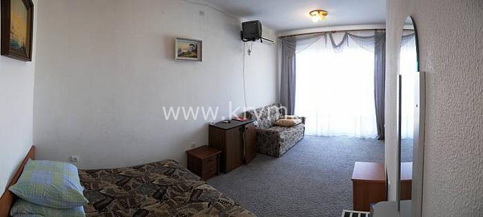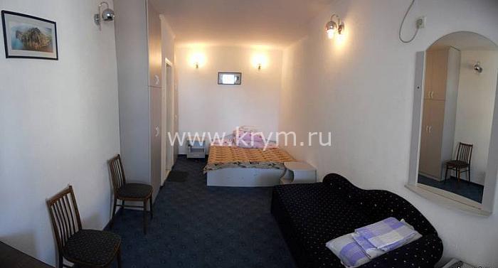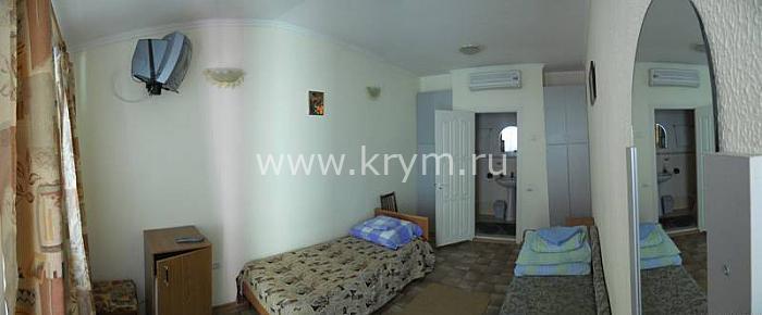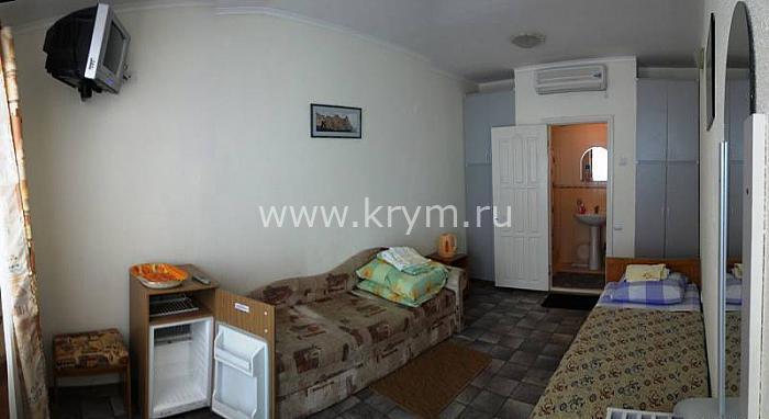 Однокомнатный 2-х местный номер + 1место (кровать+раскладывающаяся тахта), со всеми удобствами (кондиционер, кабельное ТВ, холодильник, унитаз, умывальник, душ, холодная,горячая вода круглосуточно, фен, чайник). Выход на террасу для отдыха (установлены столы, стулья). С террасы вид на море и горы, игровую площадку и бассейн.