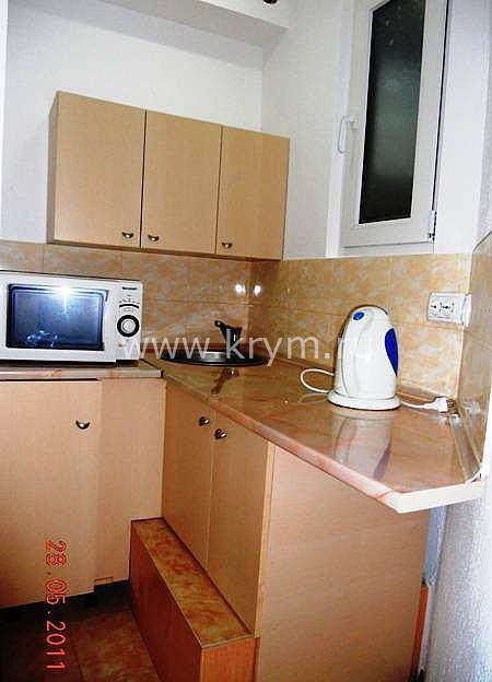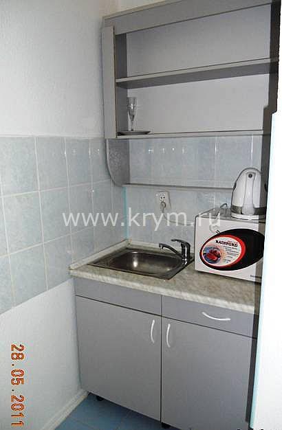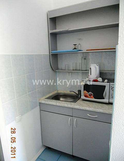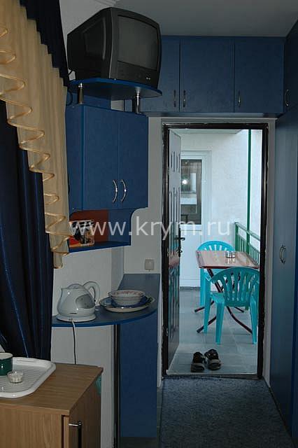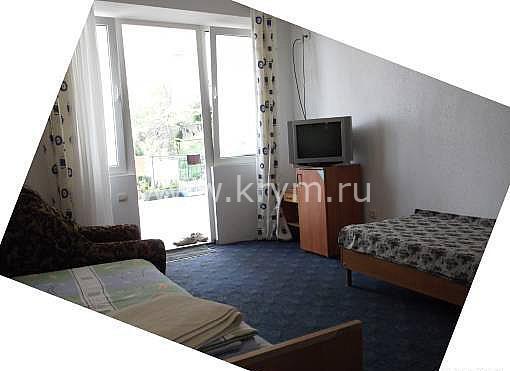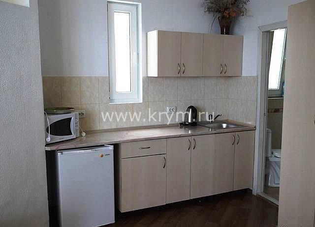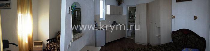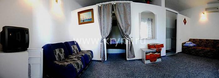 Однокомнатный 2-х местный номер+2места (2-х местная кровать и тахта), со всеми удобствами (кондиционер, кабельное ТВ, холодильник, унитаз, умывальник, душ, холодная,горячая вода круглосуточно, фен, чайник). Выход прямо на террасу для отдыха (где находится миникухня с посудой, установлены столы, стулья). С террасы вид на море и горы, игровую площадку и бассейн