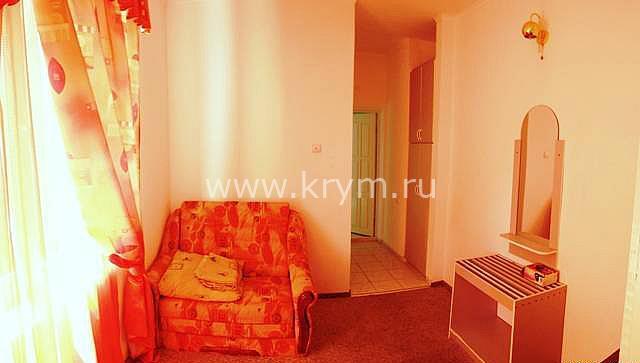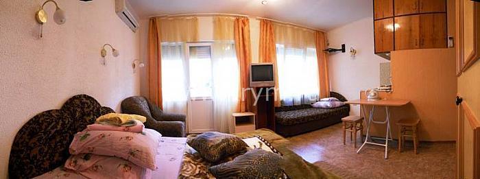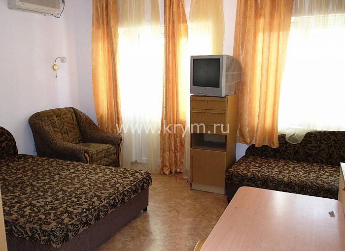 3-х местный ( 2-х местная кровать + диван (баян) до 2-х мест), со всеми удобствами (кондиционер, кабельное ТВ, холодильник, унитаз, умывальник, душ, холодная,горячая вода круглосуточно, сервант, фен, чайник). Индивидуальная лоджия - с неё вид на море , игровую площадку, кооператив и бассейн.