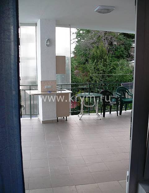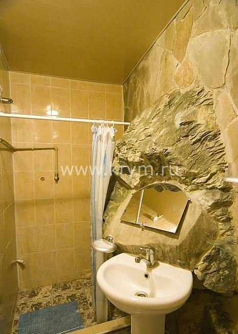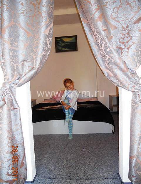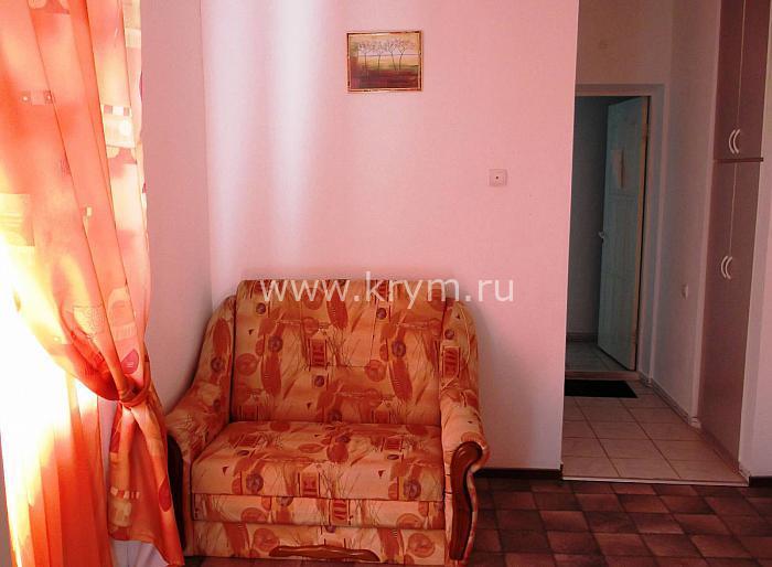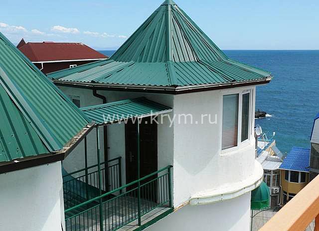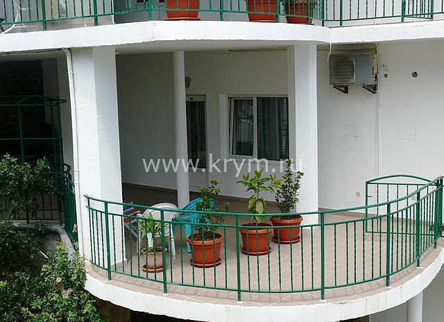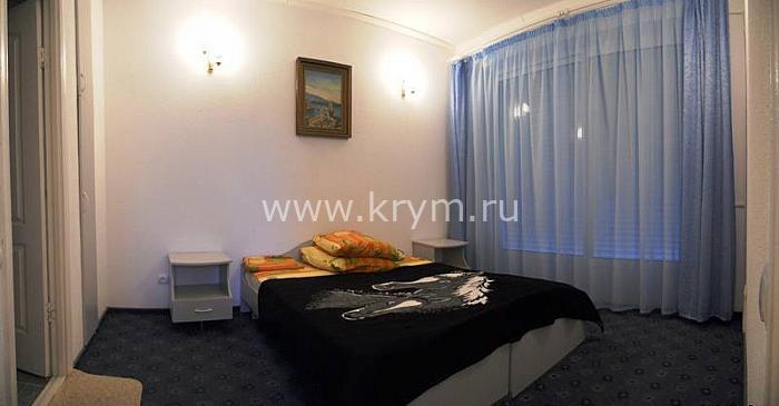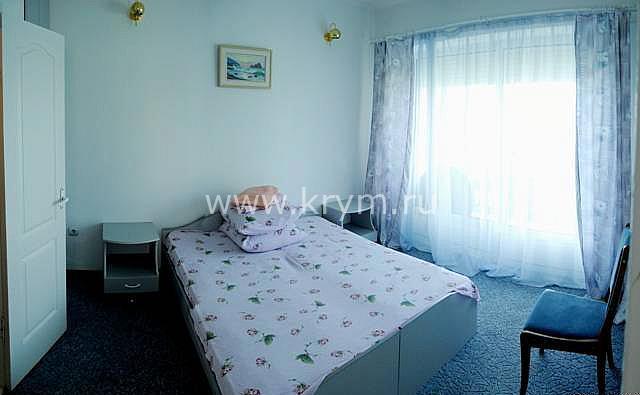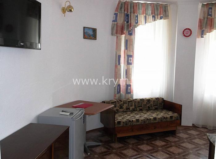 Однокомнатный, необычный, 2-х местный + 1 (2-х спальная кровать+кресло кровать) номер со всеми удобствами (кондиционер, кабельное ТВ, холодильник, санузел, холодная, горячая вода круглосуточно, сервант с посудой, фен. Панорамный вид из окон и индивидуального балкона (от горы Кастель до мыса Плака, включая море и побережье ЮБК до Солнечнегорска). Номер, для тех кто хочет уединения наслаждения природой, находится над люксами в овальной башне. Среди отдыхающий носит название "Романтический"