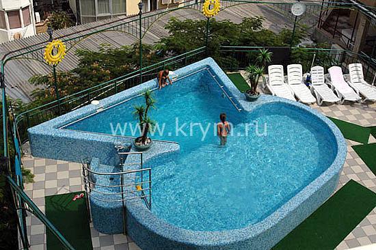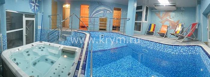 Бассейн для проживающих в гостевом доме входит в стоимость номера, работает с 7:00 до 23:00 часов с трёхчасовым перерывом на профилактику. В бассейне используется талая горная вода с озоновой очисткой. Гидромассаж (джакузи) включается трижды в день.