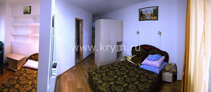 2-х комнатный, 4-х местный (+1) номер со всеми удобствами (кондиционер, кабельное ТВ, холодильник, унитаз, умывальник, душ, холодная,горячая вода круглосуточно, сервант, миникухня, фен, чайник, печь СВЧ, мультиварка). Большой балкон. Со всех окон панорамный вид на море, горы, кооператив и набережную.