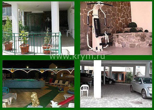Территория Гостевого дома имеет два выхода: нижний – выходящий на территорию кооператива, где расположена набережная, пляжи, магазины, кафе и рестораны; верхний – выходящий непосредственно на территорию санатория «Утес», на которой расположены лечебные корпуса (с возможностью лечения и прохождения всевозможных лечебных процедур), дикие и оборудованные пляжи (бетонные и галечные), лечебный пляж санатория, столовая, итальянская пиццерия, продуктовые и промтоварные магазины, киноконцертный зал, туристические бюро, детские и спортивные площадки расположенные в уникальном реликтовом парке "Утес" и "Карасан". Здесь же находится ландшафтный памятник природы "Мыс Плака" с видом на редкой красоты бухту и гору Аю-Даг.