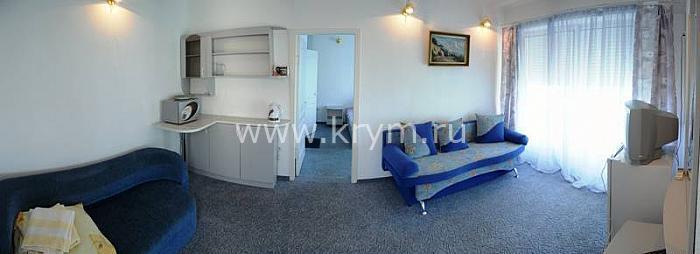 2-комнатный (между комнатами арка)4-х местный (+1) номер со всеми удобствами (кондиционер, кабельное ТВ, холодильник, унитаз, умывальник, душ, холодная, горячая вода круглосуточно, сервант, миникухня, фен, чайник, печь СВЧ). Выход прямо на террасу для отдыха (установлены столы, стулья). С террасы вид на море и горы, игровую площадку и бассейн.