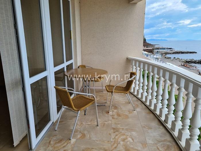 Балкон: имеет вид на море, стоит пластмассовая мебель на балконе :стол и 4 стула.